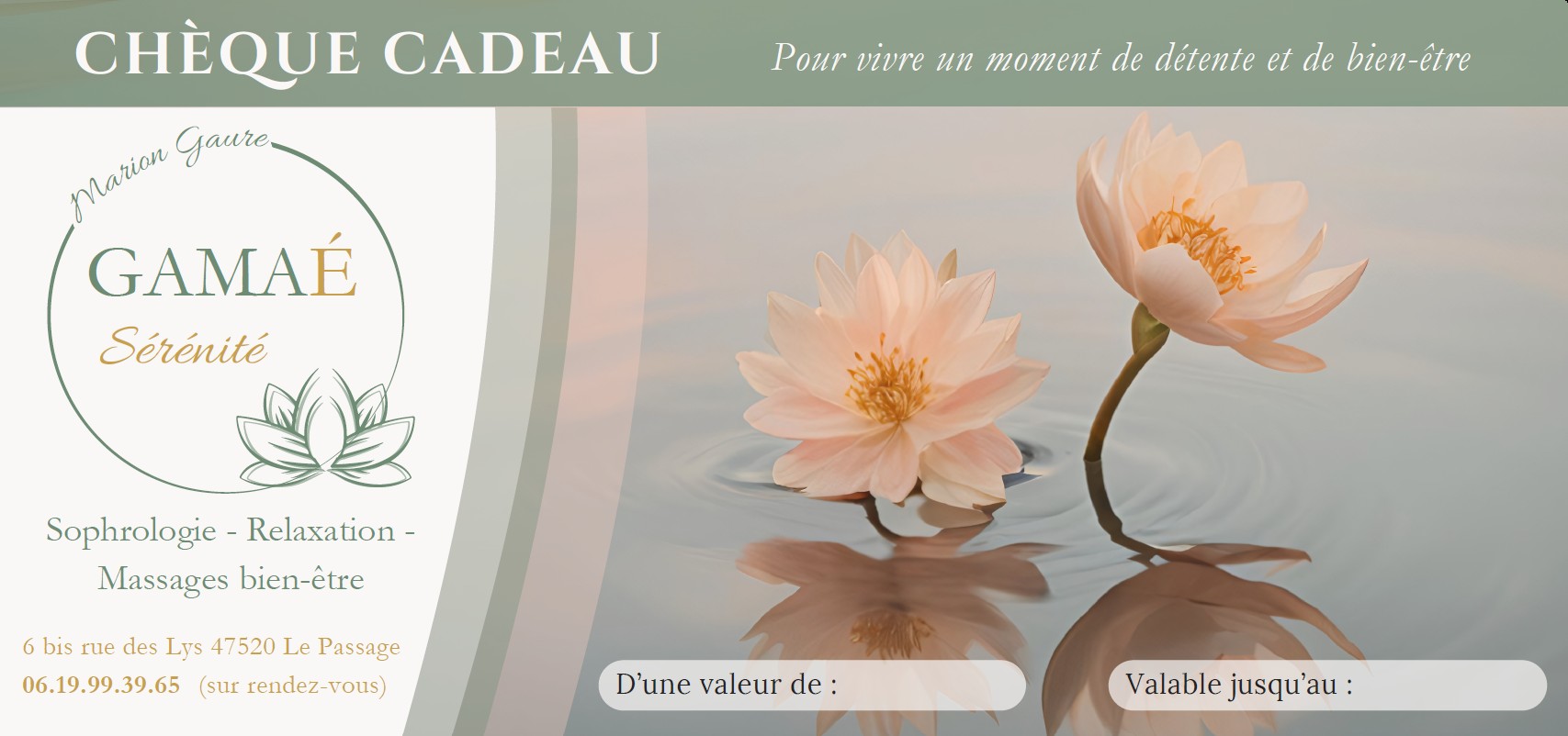 Offrez le Bien-être grâce au « Chèque Cadeau« , de la valeur de votre choix, qui pourra être utilisé pour l’ensemble des prestations de GAMAÉ Sérénité.